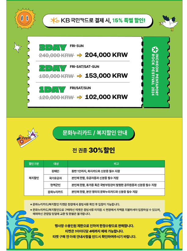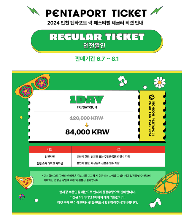 이렇게 “2024인천펜타포트 락 페스티벌”, 티켓팅, 예매, 라인업, 캠핑권 정보에 대해 알아 보았는데요. 페스티벌 좋아하시는 분들 서둘러 예매 하시고 즐거운 시간 보내셨으면 하는 마음입니다. ~~~~~ 서두르세요.