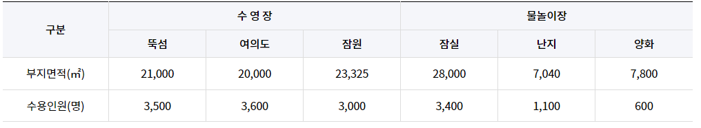 한강에는 똑섬 수영장, 여의도 수영장, 잠원 수영장, 잠실 물놀이장, 난지 물놀이장, 양화물놀이장이 개장을 앞두고 있으며,